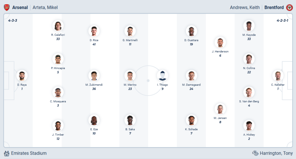 | D. Raya (G/K) Jurrien Timber Cristhian Mosquera Piero Hincapie Riccardo Calafiori Eberechi Eze Martin Zubimendi Declan Rice Bukayo Saka Mikel Merino Gabriel Martinelli | Caoimhin Kelleher (G/K) Michael Kayode Nathan Collins Sepp Van den Berg Aaron Hickey Jordan Henderson Mathias Jensen Dango Ouattara Mikkel Damsgaard Kevin Schade Igor Thiago |