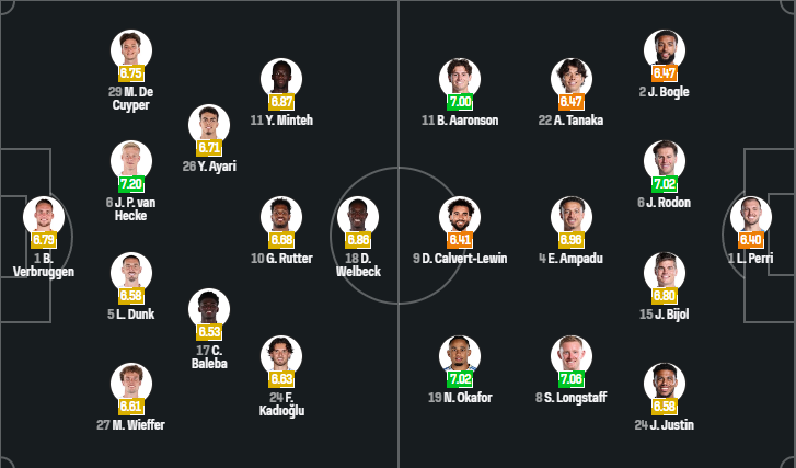 | Bart Verbruggen (G/K) Mats Wieffer Lewis Dunk Jan Paul van Hecke Maxim De Cuyper Carlos Baleba Yasin Ayari Ferdi Kadıoğlu Georginio Rutter Yankuba Minteh Danny Welbeck | Lorenzo Perri (G/K) Jayden Bogle Joe Rodon Jaka Bijol James Justin Ao Tanaka Ethan Ampadu Sean Longstaff Brenden Aaronson Dominic Calvert-Lewin Noah Okafor |