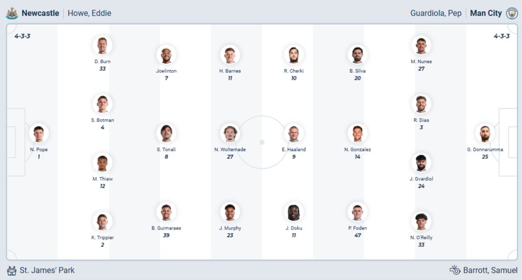 | Nick Pope (G/K) Kieran Trippier Malick Thiaw Sven Botman Dan Burn Bruno Guimaraes Sandro Tonali Joelinton Jacob Murphy Nick Woltemade Harvey Barnes | Gianluigi Donnarumma (G/K) Matheus Nunes Ruben Dias Josko Gvardiol Nico O’Reilly Bernardo Silva Nicolas Gonzalez Phil Foden Rayan Cherki Erling Haaland Jeremy Doku |