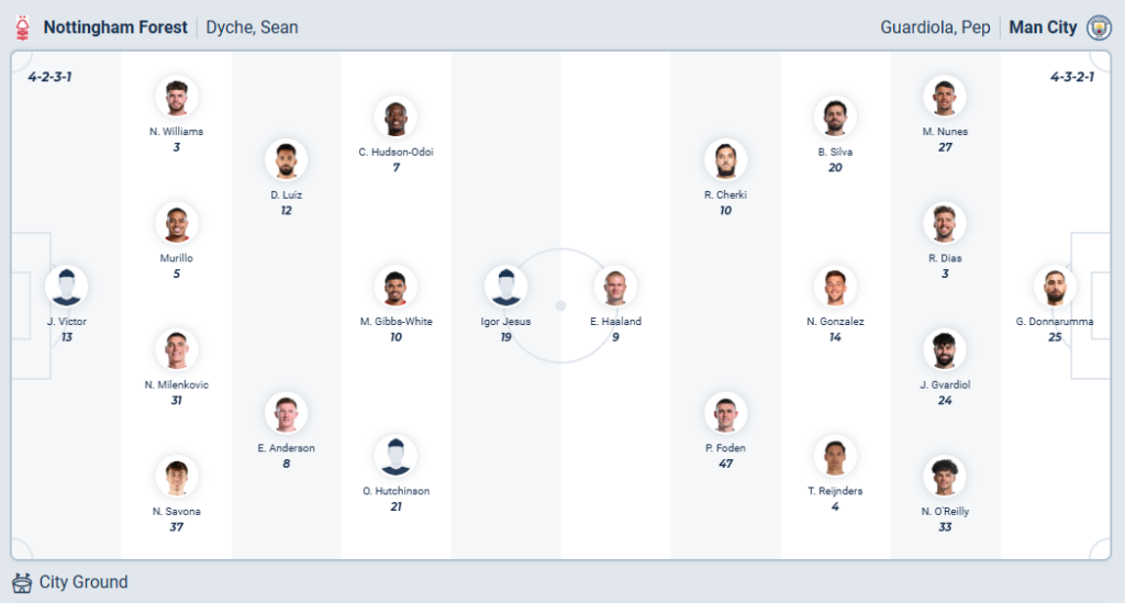 | João Victor Nicolo Savona Nikola Milenkovic Murillo Neco Williams Elliot Anderson Douglas Luiz Omari Hutchinson Morgan Gibbs-White Callum Hudson-Odoi Igor Jesus | Gianluigi Donnarumma Matheus Nunes Ruben Dias Josko Gvardiol Nico O’Reilly Bernardo Silva Nicolas Gonzalez Tijani Reijnders Rayan Cherki Phil Foden Erling Haaland |