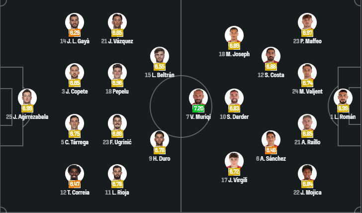 | Julen Agirrezabala (G/K) Thierry Correia César Tárrega José Copete José Luis Gayà Luis Rioja Filip Ugrinić José Luis García Vayá Jesús Vázquez Hugo Duro Lucas Beltrán | Leonardo Román Riquelme (G/K) Pablo Maffeo Martin Valjent Antonio Raíllo Johan Mojica Samuel Costa Antonio Sánchez Matija Joseph Sergi Darder Jan Virgili Vedat Muriqi |